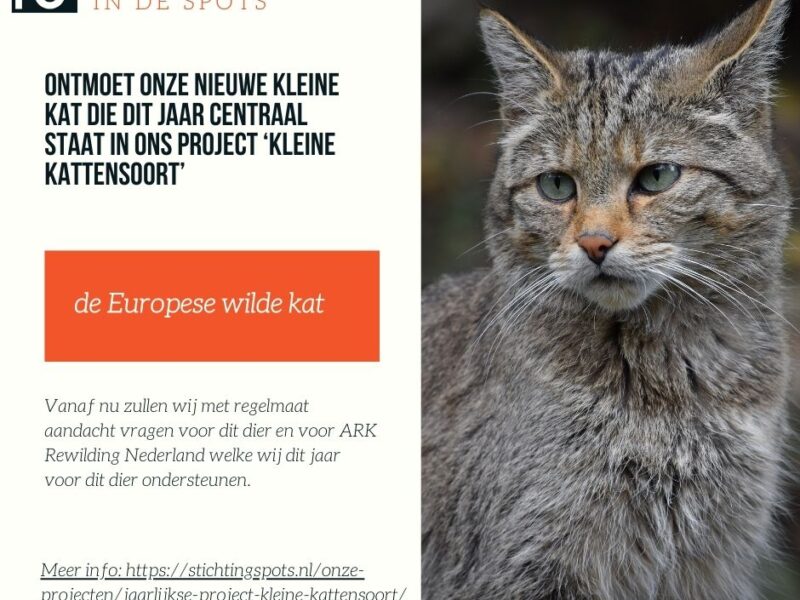 In 2026 houden wij het dicht bij huis en staat de Europese wilde kat centraal; dit dier heeft zijn weg ook weer gevonden naar Nederland. Wij ondersteunen dit jaar Ark Rewilding Nederland. Deze organisatie zet zich o.a. in voor de Europese wilde kat in Nederland. Met uw gift zullen wij hun veldlessen voor basisscholen ondersteunen. Het is immers van belang dat jongeren meer leren over dit mooie dier.